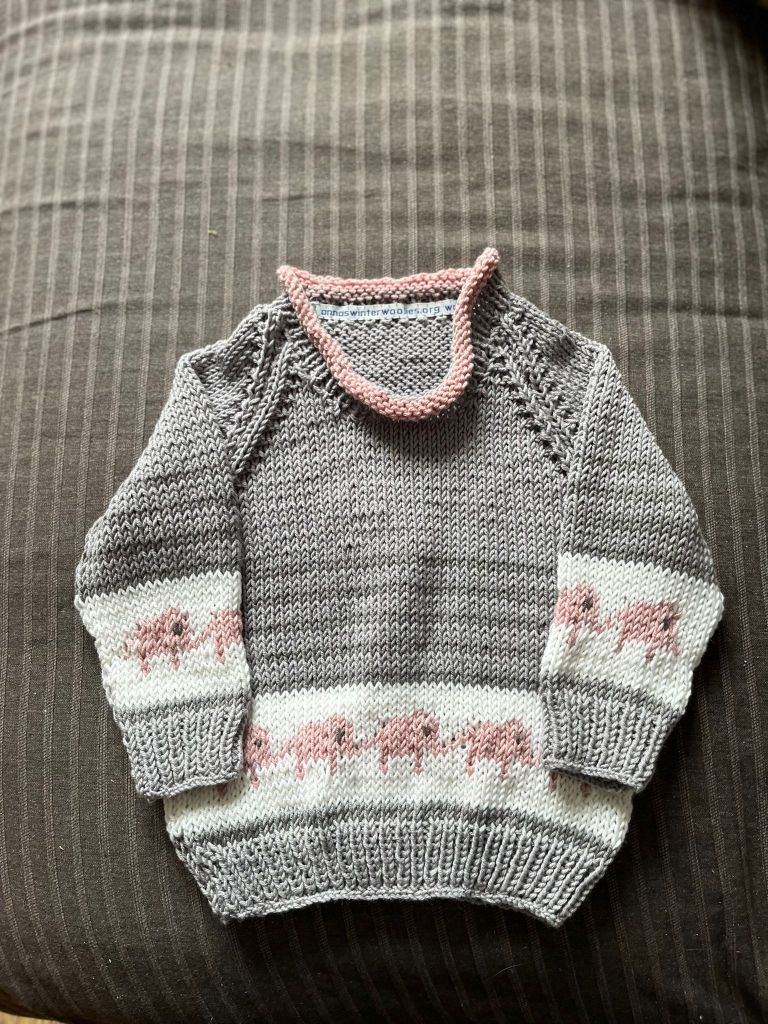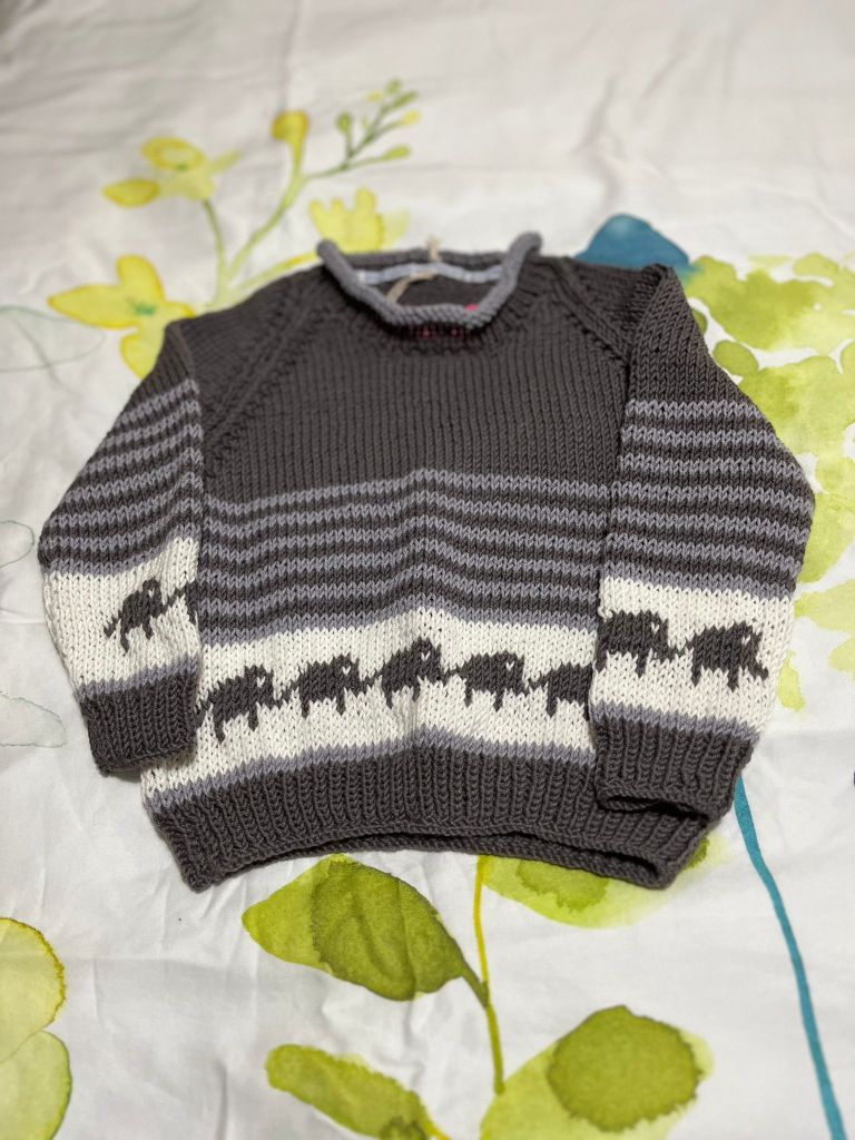 The Elephants jumper is knitted in Cotton/wool blend- 55 per cent wool/ 45 per cent cotton.
